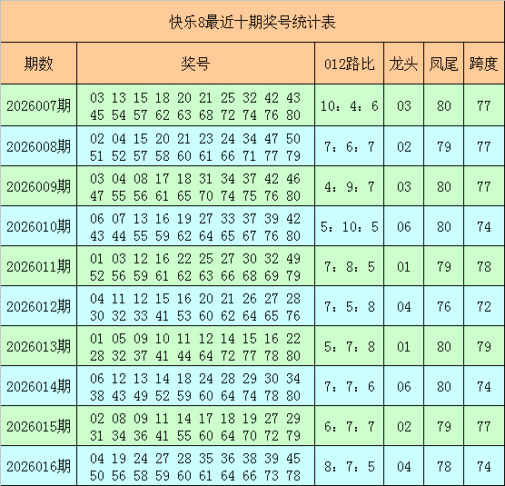 景色8第2026016期奖号为:04 19 24 27 28 35 36 38 39 45 50 56 58 59 60 61 64 66 73 78,其中奖号012路比为8:7:5,0路号码(8个):24、27、36、39、45、60、66、78,1路号码(7个):04、19、28、58、61、64、73,2路号码(5个):35、38、50、56、59。