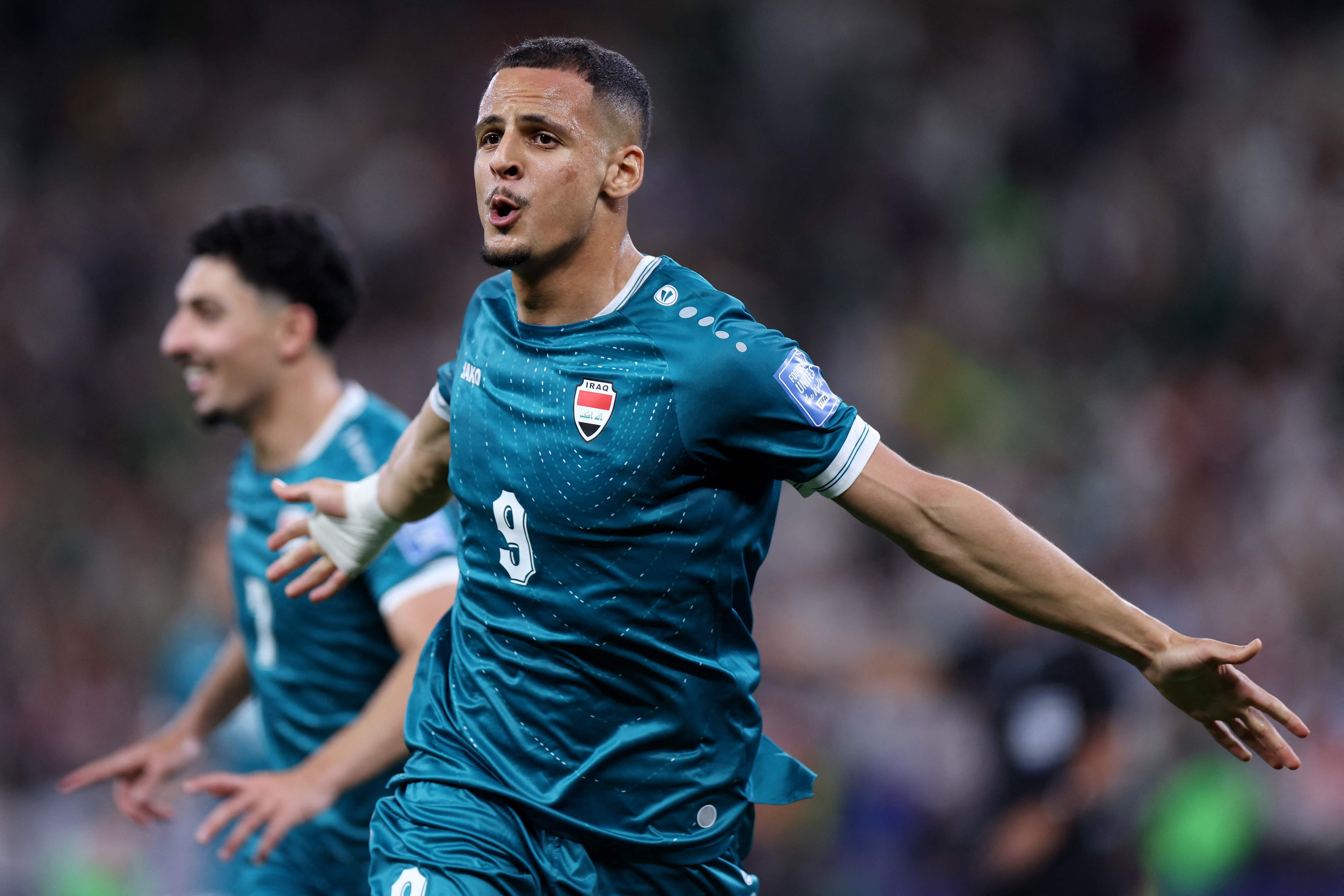 3月31日,伊拉克队球员哈马迪(右)在比赛中庆祝进球。新华社/法新电视转播里,阐述员一遍遍呼喊着进球元勋的姓名;茶楼内,有东说念主使劲拍打着茶几,有东说念主高举着双臂,有东说念主相互拥抱将红茶一饮而尽。