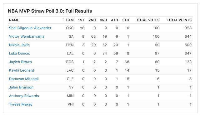 本次票选在好意思国期间本周一至周三之间进行选票相聚,这是ESPN本赛季第三次,亦然临了一次组织媒体东谈主进行MVP票选,上一次是在全明星周末工夫,那时亚历山大以78张第一选票领跑。流程了一个半月的强烈角逐,文班亚马竭力追逐亚历山大,并平直放话我方念念要拿到MVP。但就咫尺而言,法国新星并莫得镌汰我方和亚历山大之间的差距。
